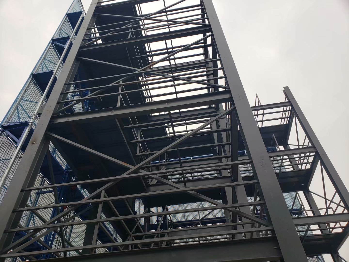 附着式升降脚手架由竖向主框架、水平支撑桁 架、架体构架、提升系统、附着支撑结构及转 换装置、电气系统组成。 主框架包含的构件有:立杆下接头、导轨立杆 下接头、立杆对接管、立杆接头夹板、立杆、 导轨处立杆及立杆三角撑。